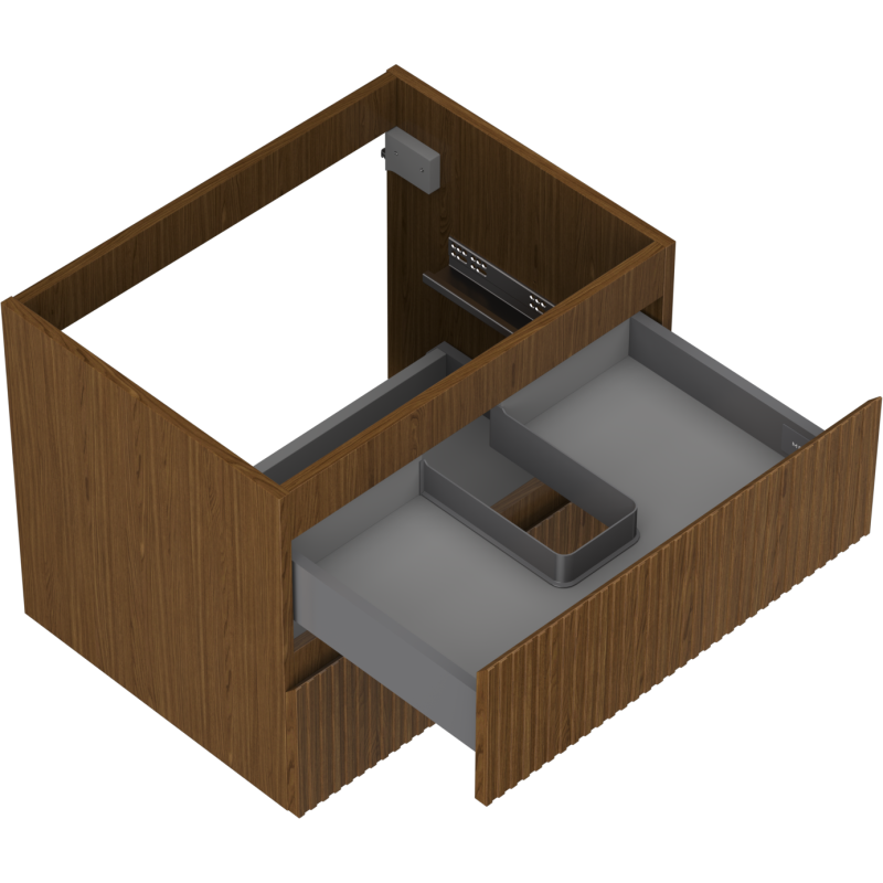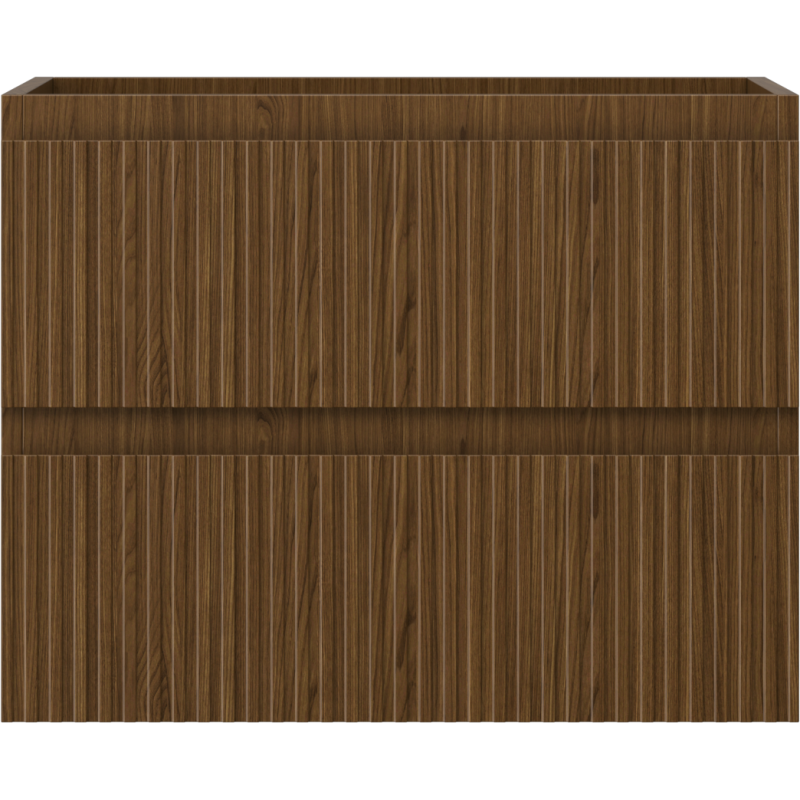 Korpus er produsert i plate belagt med PVC-folie i valnøtt, noe som gir god motstand mot daglig bruk og fukt i baderomsmiljøet. Frontene er laget av MDF-plate med PVC-folie, også i valnøtt, og har en dekorativ, riflet struktur som understreker det elegante designet. Servantskap til bad fra Mexen-serien Rivel kan kombineres med benkeplate eller toppmontert servant for å skape en helhetlig løsning tilpasset din stil.