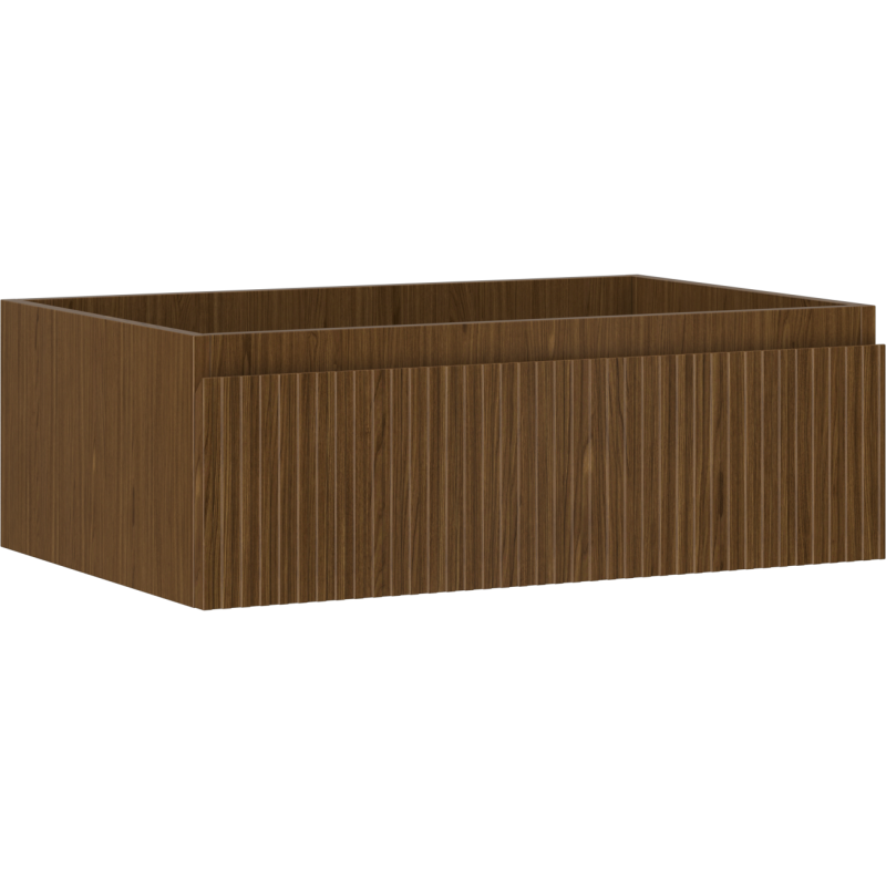 UV-bestandig overflate og slitesterke materialer sørger for lang levetid og enkel rengjøring. Den dekorative, riflede valnøttfronten gir baderomsmøbelet et tidløst og eksklusivt preg som passer godt inn i moderne baderomsinnredninger.