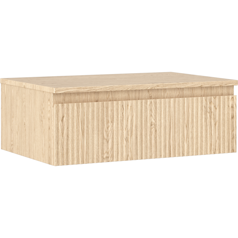Servantskapet leveres i fargen eik, både på korpus og front, noe som gir et varmt og naturlig preg i baderommet. Fronten har en dekorativ riflet struktur som gir et eksklusivt og moderne uttrykk. Korpus er produsert i plate belagt med PVC-folie, mens front og benkeplate er laget av MDF-plate med PVC-folie, noe som gir en slitesterk og lettstelt overflate. Dette servantskapet til bad monteres på vegg og gir et luftig inntrykk samt enklere rengjøring av gulvet under.