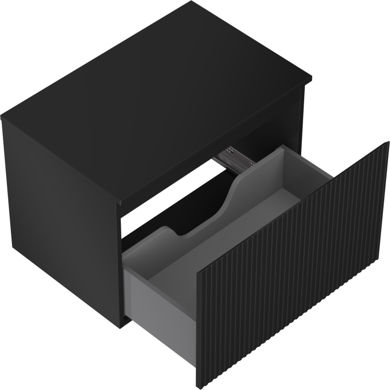 Servantskapet leveres med en hel toppplate og er utført i svart matt, både på korpus og riflet front. Den kompakte høyden og dybden gjør det godt egnet til mindre og mellomstore bad, samtidig som det gir god oppbevaringsplass i én romslig skuff. Mexen Rivel servantskap til bad er veggmontert, noe som gir et lett og moderne uttrykk samt enklere rengjøring under møbelet.