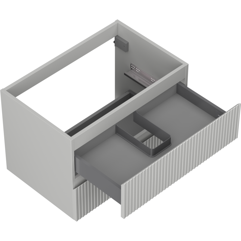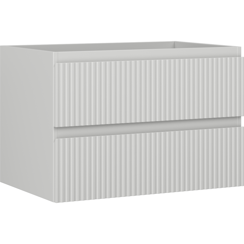 Korpus er produsert i lakkert plate i fargen grå matt, mens frontene er laget av lakkert MDF-plate i samme grå matt utførelse. De riflede frontene gir et eksklusivt og moderne uttrykk, og gjør dette baderomsmøbelet til et blikkfang i ethvert servantskap til bad.