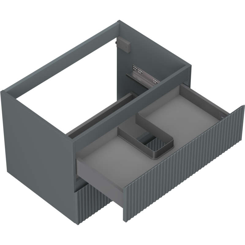 Korpus er laget av lakkert plate, mens frontene er produsert i lakkert MDF av høy kvalitet. Den gjennomførte grafittfargen på både korpus og fronter gir en helhetlig og moderne riflet baderomsinnredning som harmonerer godt med andre baderomsmøbler. Servantskapet er et ideelt valg som servantskap til bad der man ønsker et tidløst, men samtidig markant design.