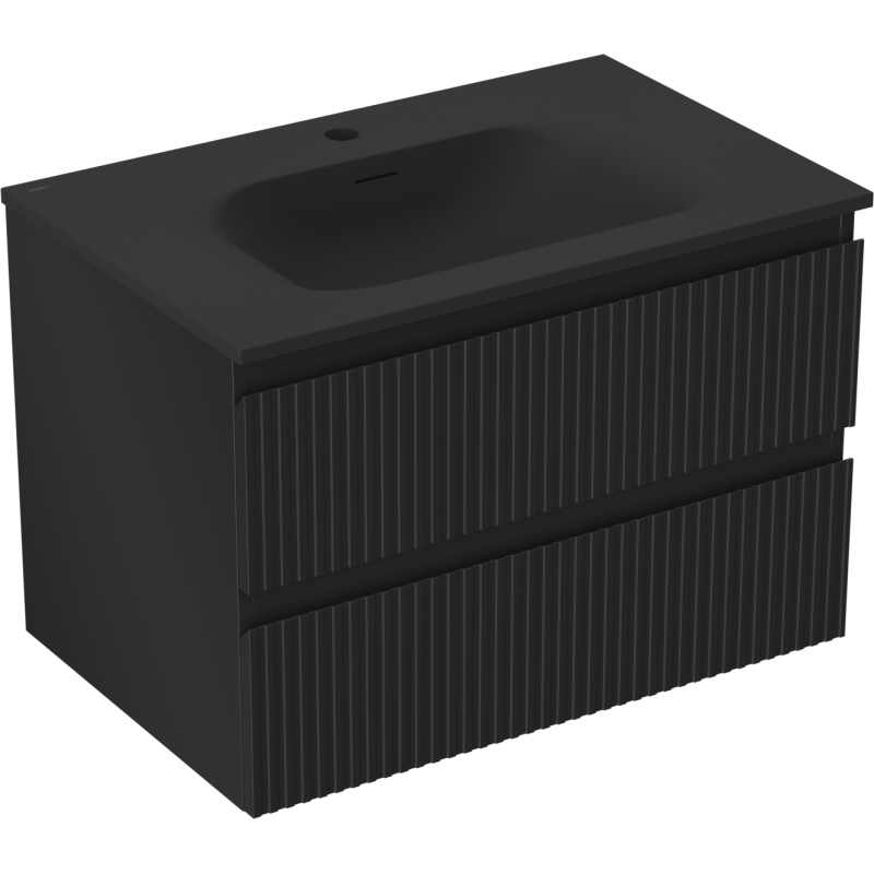 Myk lukking i skuffene sørger for stille og behagelig bruk, noe som er spesielt praktisk i husholdninger der baderommet brukes tidlig og sent på dagen. Det moderne, svarte matte uttrykket og de riflede frontene gjør at dette baderomsskapet med servant enkelt kan kombineres med annet interiør og armaturer, og passer både i minimalistiske og mer eksklusive baderomsløsninger.