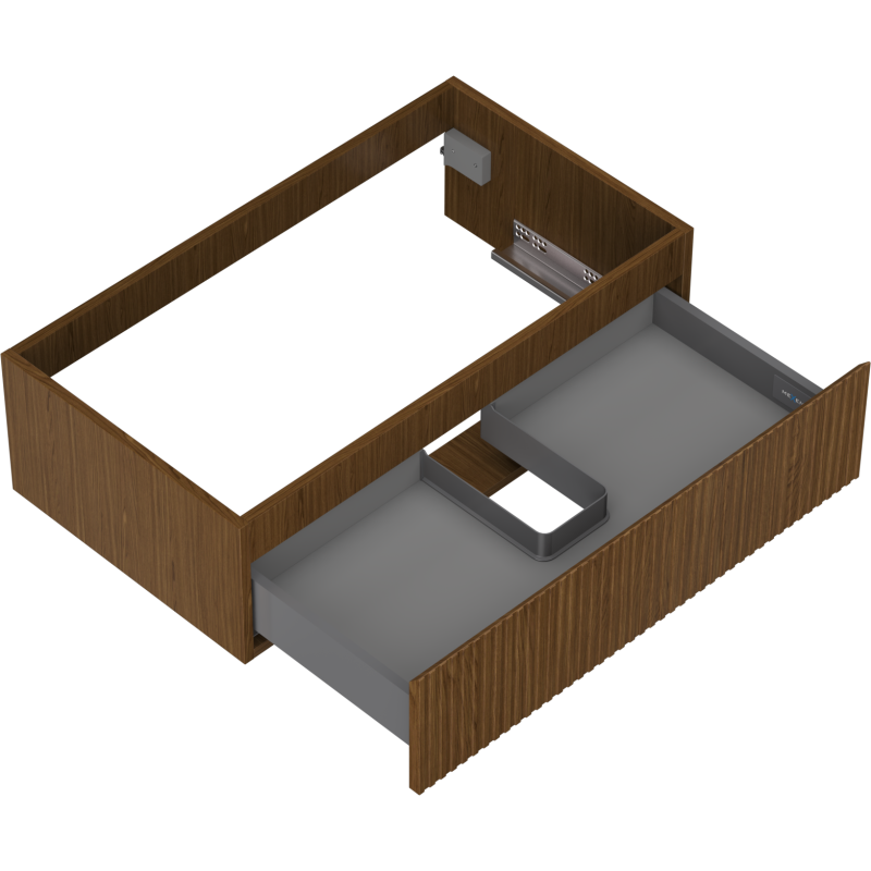 Skuffen har innebygd funksjon for myk og stille lukking (myk lukking), som øker komforten i hverdagen og reduserer slitasje på beslag og fronter. Overflaten på både korpus og front er belagt med PVC-folie som er motstandsdyktig mot UV-stråler, slik at servantskap i valnøtt beholder fargen og ikke falmer over tid, selv i lyse baderom. Materialvalget gjør dette til et robust servantskap til bad med lang levetid.