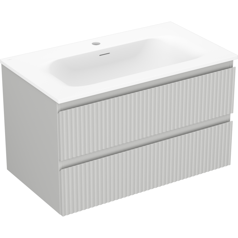 Servant med skap i Mexen Rivel-serien er utviklet med fokus på kvalitet og komfort i bruk. Korpuset er laget av lakkert møbelplate, mens frontene er produsert i lakkert MDF med riflet struktur. Denne kombinasjonen gir et robust baderomsmøbel i grå matt som tåler daglig bruk, samtidig som det ser eksklusivt ut. Overflaten er UV-bestandig, noe som beskytter farge og finish mot falming over tid.