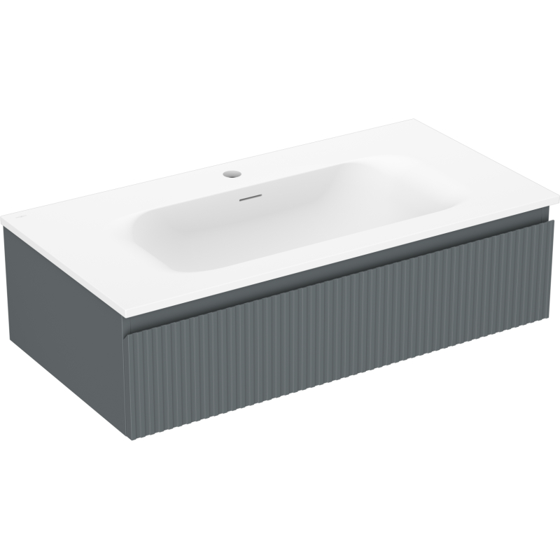 Skapet har en matt grafittfarget kropp og front, der fronten er dekorativt riflet for å gi en eksklusiv og moderne riflet baderomsinnredning. Den hvite, matte Vela-servanten i kompositt danner en elegant kontrast til det mørke grafittmatte servantskapet, og skaper en harmonisk helhet som passer inn i både små og store bad.
