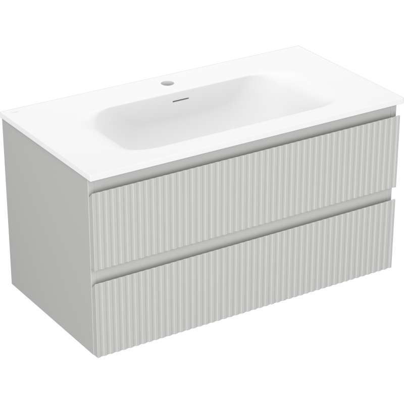 Servantskapet har et kompakt og samtidig romslig design med bredde 90 cm, dybde 46 cm og høyde 47 cm. Korpus er laget av lakkert møbelplate i grå matt utførelse, mens frontene er i lakkert MDF med karakteristisk riflet struktur. Som et komplett baderomsskap med servant leveres settet med Vela-servant i hvit matt konglomerat, tilpasset skapets mål og vegghengt montering.