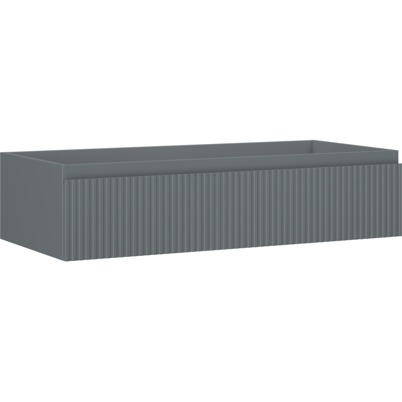 Servantskapet har en bredde på 100 cm, høyde på 23,5 cm og dybde på 46 cm, noe som gjør det til et plassbesparende, men samtidig romslig valg. Korpus og front leveres i grafitt matt, med en moderne, riflet frontstruktur som gir et eksklusivt og tidløst preg til ethvert servantskap til bad.