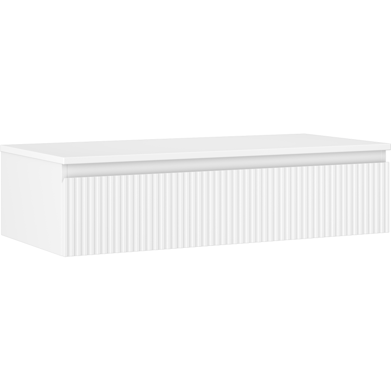 Mexen Rivel er et moderne servantskap til bad i stilren hvit matt utførelse, designet som et veggmontert underskap uten vask. Med en bredde på 100 cm og lav høyde gir dette baderomsmøbelet et lett og minimalistisk uttrykk, samtidig som det tilbyr praktisk oppbevaring i en romslig skuff. Den riflede fronten gir en eksklusiv og moderne riflet baderomsinnredning som passer godt inn i nordiske baderom.