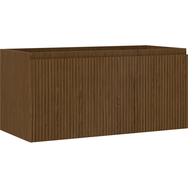 Mexen Rivel er et moderne og elegant servantskap til bad med bredde på 100 cm, designet for stilrene og funksjonelle baderom. Dette vegghengte servantskapet uten vask har en markant riflet front i valnøtt som gir møbelet et dekorativt og eksklusivt uttrykk, samtidig som det passer godt inn i moderne interiørstiler.