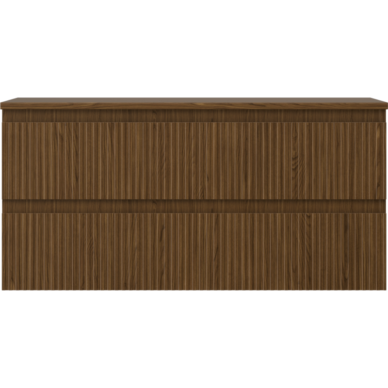 De glatte overflatene med PVC-folie er enkle å rengjøre og vedlikeholde, samtidig som den UV-bestandige overflaten bidrar til lang levetid og motstand mot falming. Mekanismen for myk lukking sørger for stille og kontrollert lukking av skuffene, noe som gir økt komfort i hverdagen og beskytter både innhold og møbel. Den riflete fronten i valnøtt gir et moderne og eksklusivt uttrykk som løfter helhetsinntrykket av baderommet.