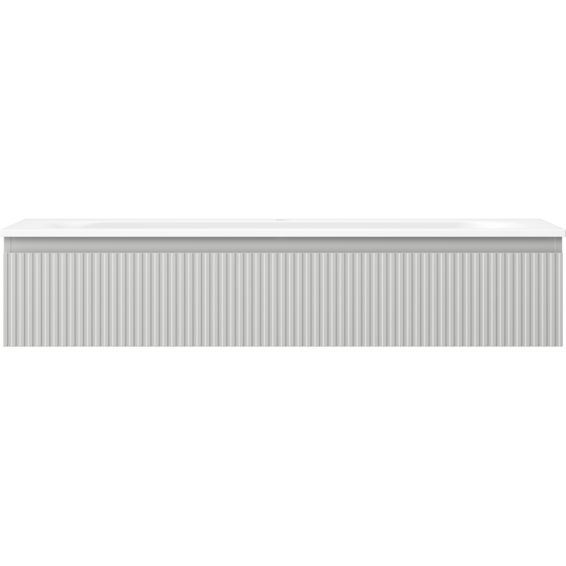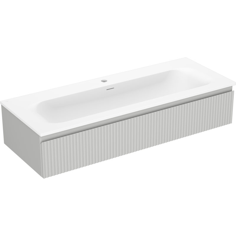 Skapet har en bredde på 120 cm, dybde på 46 cm og høyde på 23,5 cm, noe som gir god oppbevaringsplass uten å virke dominerende på veggen. Korpus og front leveres i grå matt utførelse, der fronten har en dekorativ riflet struktur som gir en eksklusiv og tidsriktig stil. Den medfølgende vasken i hvit matt overflate skaper en flott kontrast mot det grå matte servantskapet og gir helheten et elegant preg.