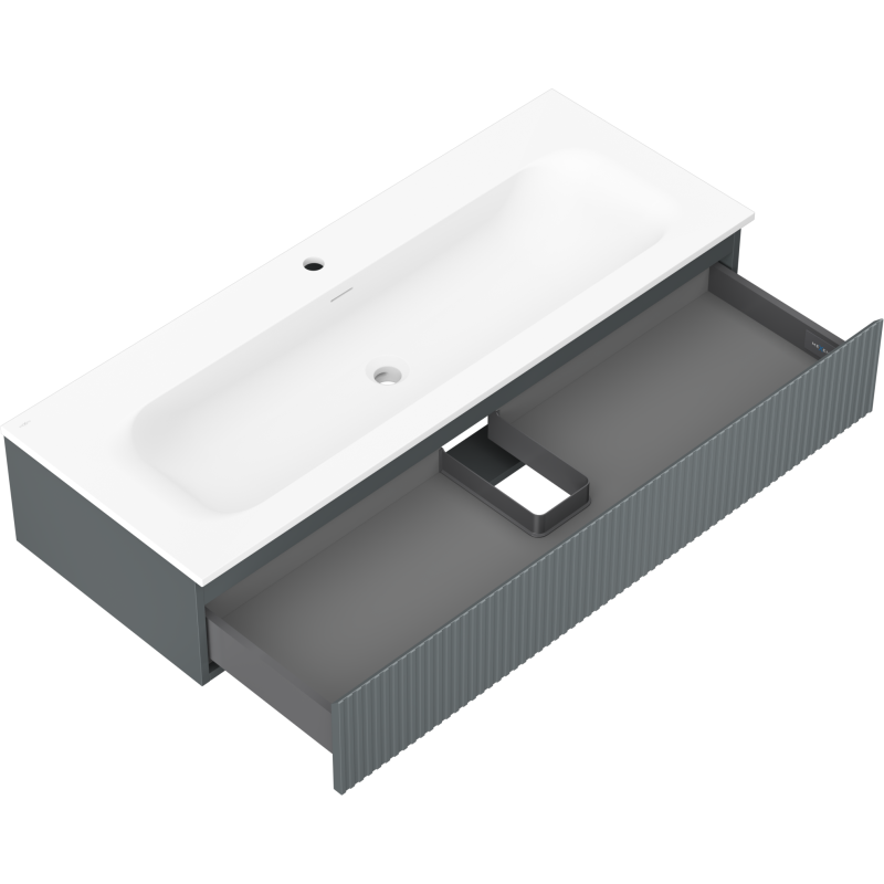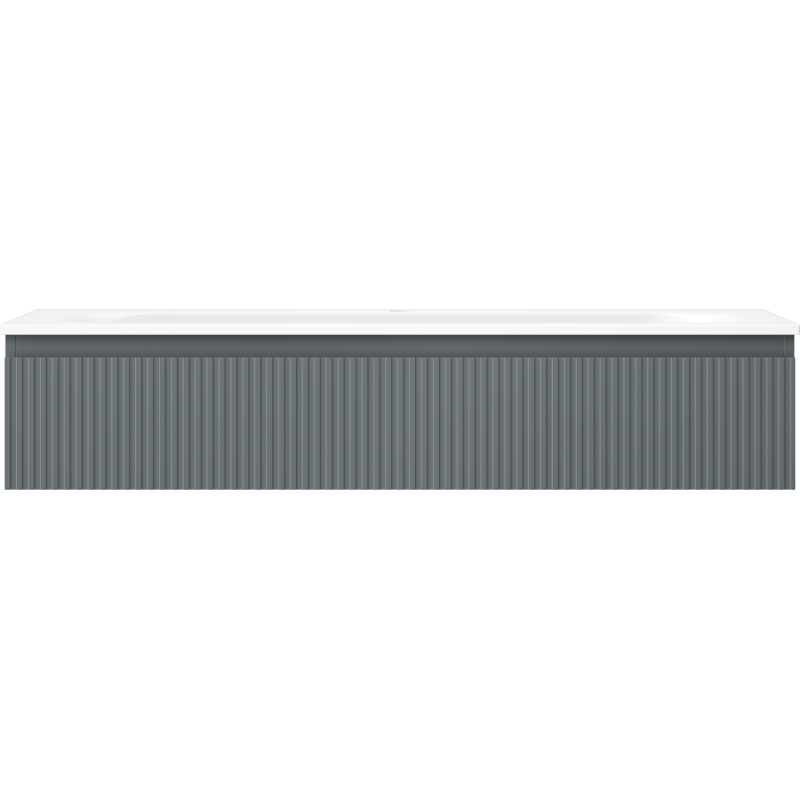 Servantskapet har et minimalistisk, rektangulært design med lav høyde, som gir et lett og svevende uttrykk på veggen. Fronten har en dekorativ, riflet struktur som understreker det moderne formspråket, mens både korpus og front er utført i elegant grafitt matt. Den integrerte vasken følger møbelets linjer og gir et helhetlig baderomsskap med servant som passer godt inn i moderne interiører.