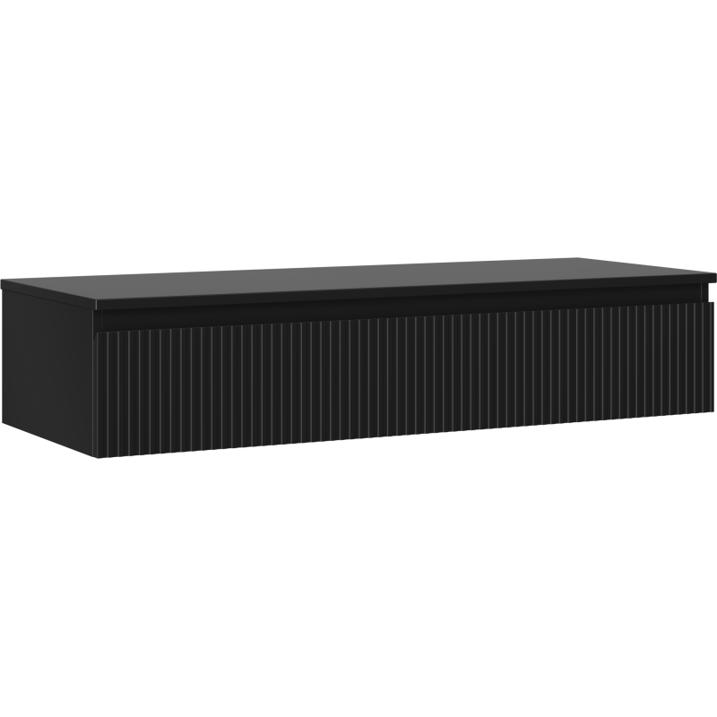 Mexen Rivel er et moderne servantskap til bad i bredde 120 cm, designet som et veggmontert servantskap uten vask. Møbelet består av et lavt underskap med én stor skuff og en tilpasset toppplate, noe som gir en stilren og minimalistisk løsning for baderommet. Den riflete fronten og den gjennomførte svart matt-fargen gir et eksklusivt uttrykk som passer perfekt i moderne interiører.