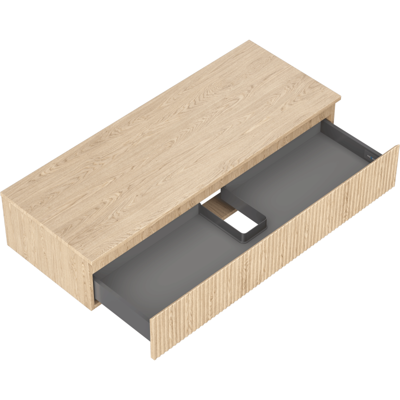 Korpus og fronter leveres i fargen eik, noe som gir et varmt og naturlig uttrykk som passer godt inn i ulike baderomsstiler. Fronten har en dekorativ riflet struktur som gir baderomsmøbelet et eksklusivt og tidsriktig preg. Som et komplett baderomsmøbel i eik med toppplate gir dette servantskapet til bad en solid base for montering av servant etter eget valg.