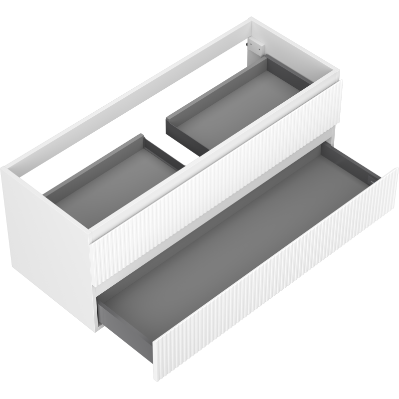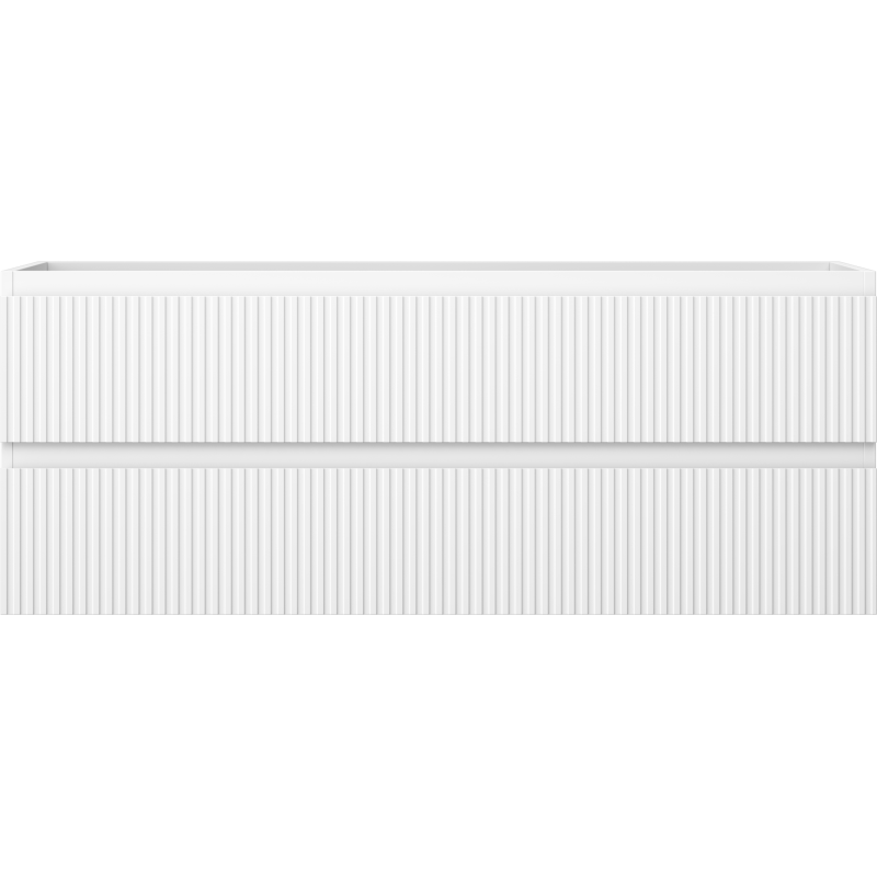 Dette underskapet til servant er utviklet for å kombinere moderne design med praktiske løsninger til hverdagsbruk. Overflatene i hvit matt er UV-bestandige, noe som bidrar til at fargen holder seg pen over tid og at baderomsmøbelet beholder sitt estetiske uttrykk selv ved daglig bruk. Riflet front gir et karakteristisk og moderne preg som skiller seg ut i baderomsinnredningen.