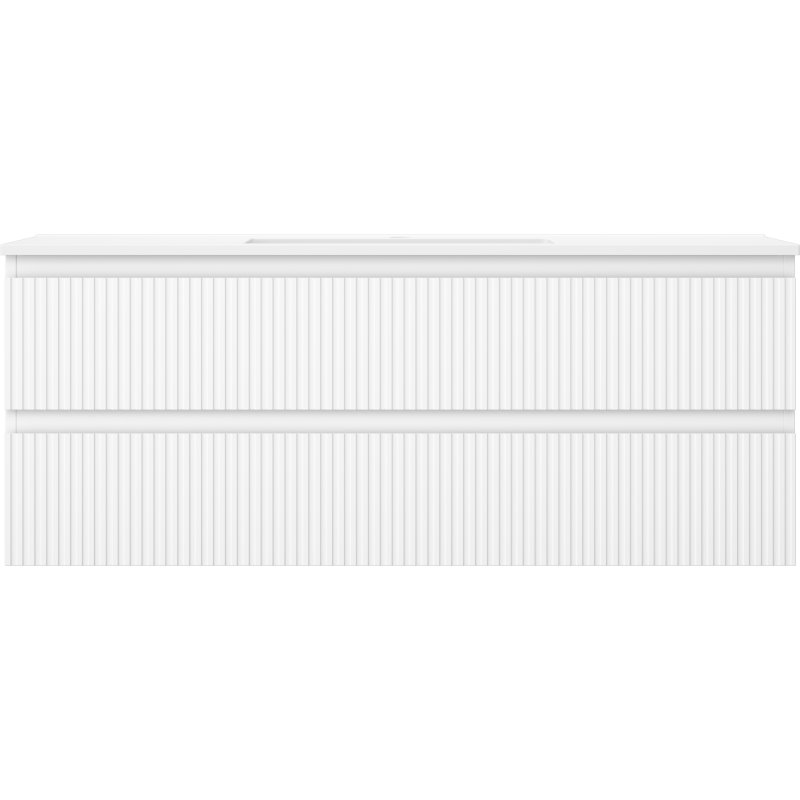 Frontene har en elegant, riflet struktur som tilfører dybde og karakter til møbelet uten å gå på kompromiss med den minimalistiske stilen. Overflatene på skapet er UV-bestandige, noe som bidrar til at den hvit matte fargen holder seg pen over tid uten å gulne. Den medfølgende servanten i konglomerat (komposittmateriale) i hvit matt utførelse har både overløp og forboret hull til armatur, noe som gjør den praktisk og trygg i bruk.