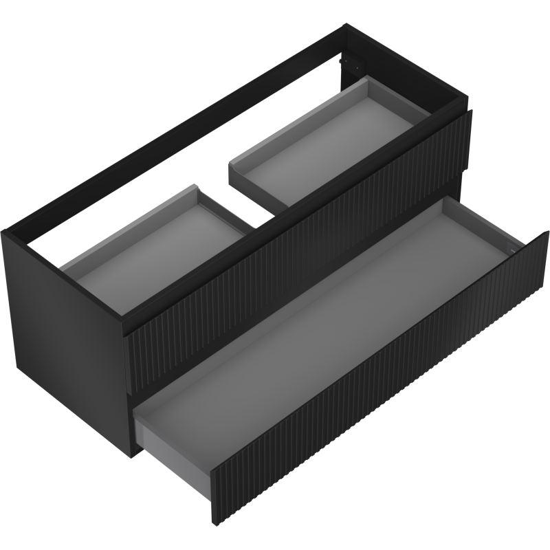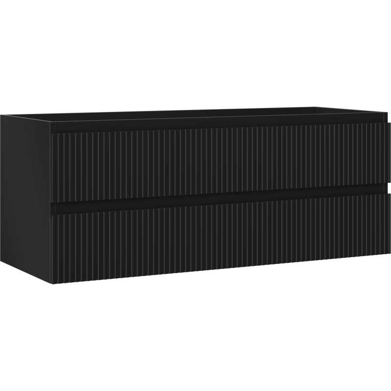 Det stilrene baderomsmøbelet har en helhetlig utførelse i svart matt med karakteristiske riflede fronter som gir et eksklusivt og designorientert uttrykk. Kombinasjonen av lakkert møbelplate i korpus og lakkert MDF i frontene gir et solid og slitesterkt servantskap til bad som tåler daglig bruk.