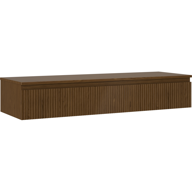 Fronten har en karakteristisk riflet struktur i fargen valnøtt, som gir en eksklusiv og tidløs riflet baderomsinnredning. Korpus og front er laget av platekonstruksjon med PVC-folie, noe som gir en jevn og slitesterk overflate. Med sin lave høyde på 23,5 cm og dybde på 46 cm passer dette servantskapet godt inn i både små og store baderom. Som et servantskap til bad uten vask gir det deg full fleksibilitet til å velge ønsket servant og armatur.