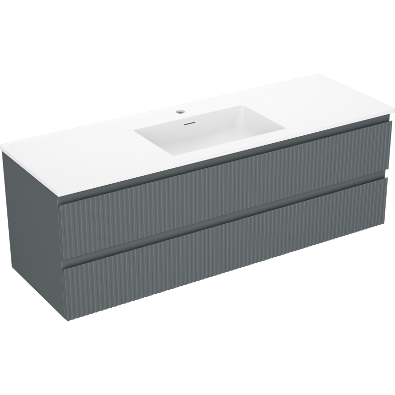 Servantskapet er utført i grafitt matt, med korpus i lakkert plate og fronter i lakkert MDF. Frontene har en dekorativ, riflet struktur som gir et eksklusivt og moderne uttrykk. Den vegghengte konstruksjonen gir et lett og svevende inntrykk og gjør rengjøring av gulvet enklere, samtidig som du får et servantskap 140 cm som utnytter plassen optimalt.