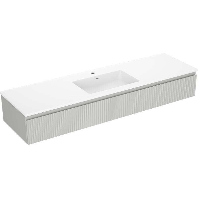 Med en skapbredde på 160 cm og en tilpasset Otis-servant i hvit matt konglomerat får du et komplett baderomsskap med servant som passer perfekt i større bad der god avlastnings- og oppbevaringsplass er viktig.