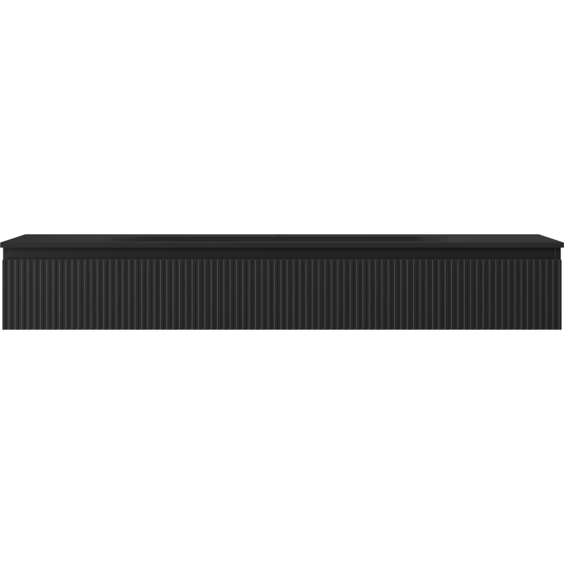 Servantskapet har en bredde på 160 cm, dybde på 46 cm og høyde på 23,5 cm, og leveres med en tilhørende Vela-servant som måler 161 x 46,5 x 16,5 cm (bredde x dybde x høyde). Korpus er laget av lakkert plate i svart matt, mens fronten er produsert i lakkert MDF med dekorativ, riflet struktur. Dette gir et eksklusivt uttrykk og gjør Mexen Rivel-servantskapet til et naturlig midtpunkt i svart matt baderomsinnredning.