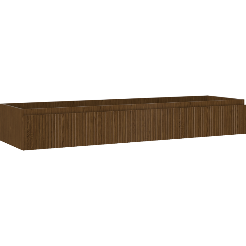 Servantskapet har en bredde på 160 cm, høyde på 23,5 cm og dybde på 46 cm, noe som gjør det ideelt for større bad der man ønsker en riflet baderomsinnredning med tydelig designpreg. Både korpus og front er utført i valnøttfarge, som gir et varmt og elegant uttrykk og gjør dette til et tidløst baderomsmøbel i valnøtt som passer i moderne så vel som klassiske interiører.