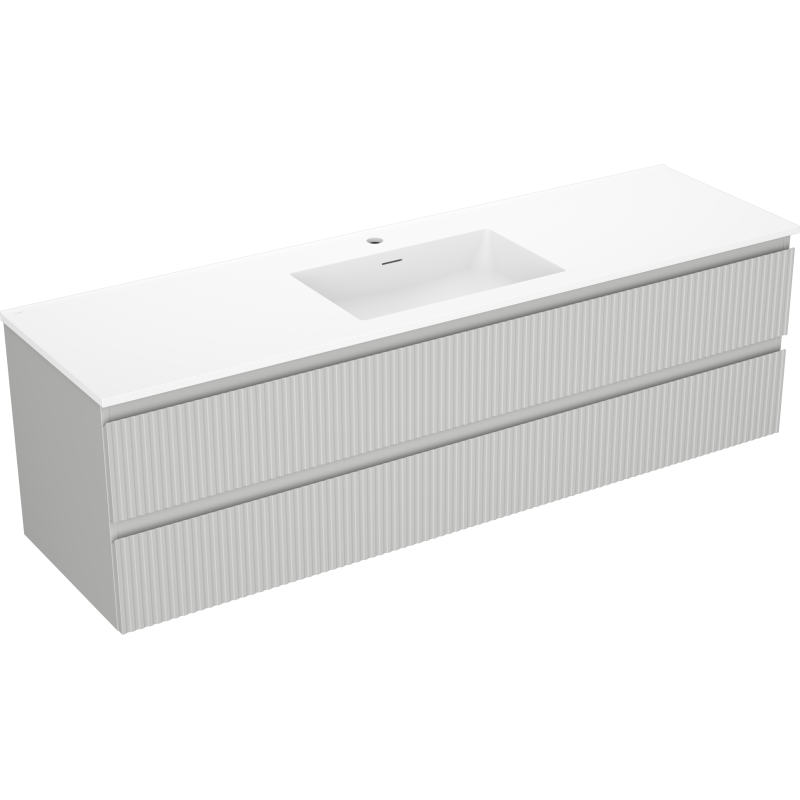 Servantskapet har en bredde på 160 cm og er utført i grå matt finish, både på korpus og fronter. Frontene har en dekorativ, riflet struktur som gir møbelet et tydelig designpreg og gjør at dette servantskapet på 160 cm skiller seg ut i baderommet. Den vegghengte konstruksjonen frigjør gulvplass, gir et luftig inntrykk og gjør rengjøring enklere.