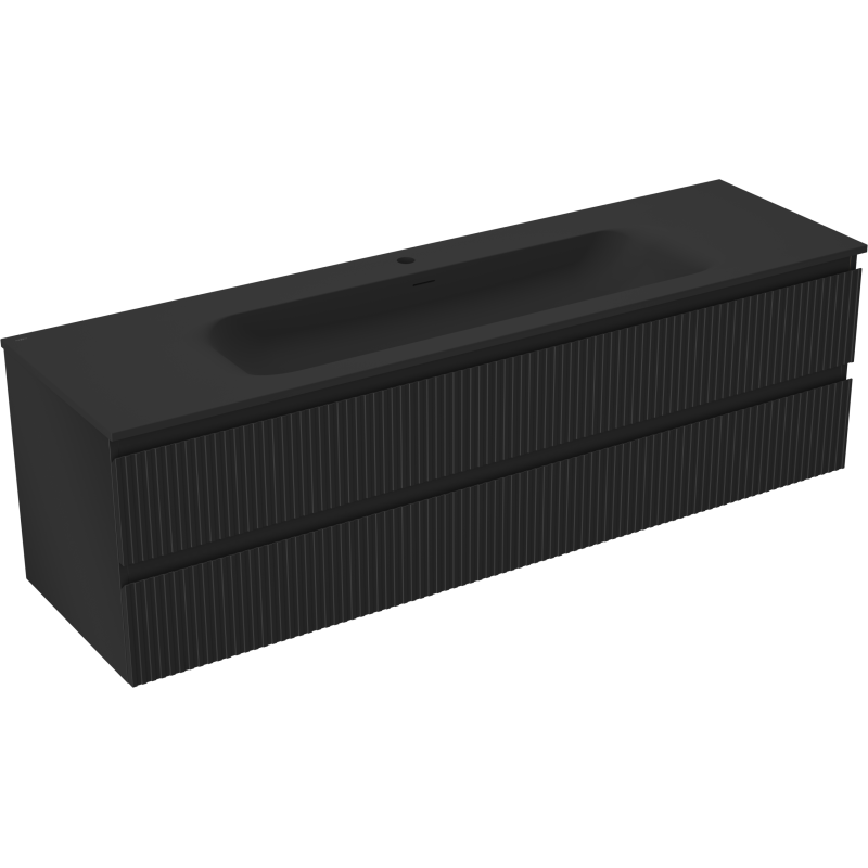 Servantskapet har et minimalistisk design med riflet front i svart matt, som gir en eksklusiv og moderne struktur. Korpus er produsert i lakkert plate, mens frontene er laget av lakkert MDF, noe som sikrer høy formstabilitet og et jevnt, estetisk utseende. Som hengende servantskap frigjør det gulvplass, gjør renhold enklere og gir et lett og luftig uttrykk på badet.