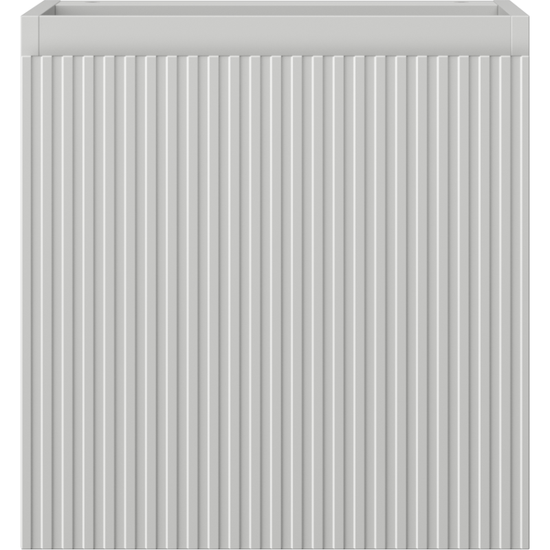 Servantskapet har både kropp og front i grå matt, noe som gir et rolig og moderne preg. Fronten har en dekorativ riflet struktur som tilfører baderommet et eksklusivt og minimalistisk uttrykk. Konstruksjonen er basert på lakkert møbelplate i korpuset og lakkert MDF-plate i fronten, noe som gir god stabilitet og en jevn, slitesterk overflate. Dette servantskapet til bad er beregnet for veggmontering sammen med servant eller benkeplate, avhengig av ønsket baderomsløsning.