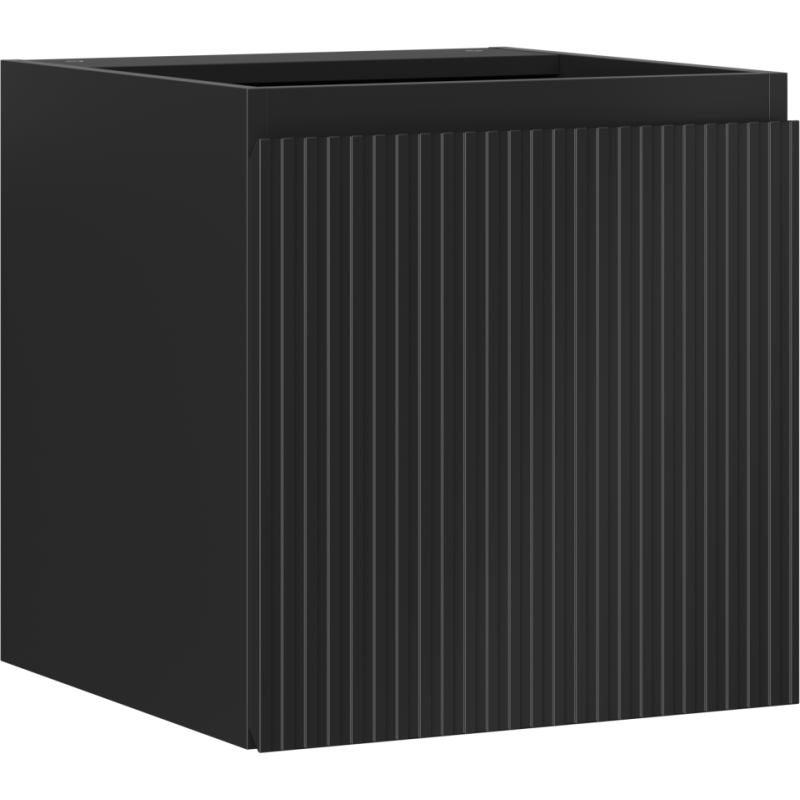 Hengsler med myk lukking sørger for stille og behagelig lukking av døren, noe som er spesielt praktisk i husholdninger der badet brukes ofte, også tidlig om morgenen eller sent på kvelden. Den svarte matte fargen og den riflede fronten gir et moderne uttrykk som gjør servantskapet til bad til et naturlig blikkfang i baderomsinnredningen, samtidig som det er robust og funksjonelt i daglig bruk.