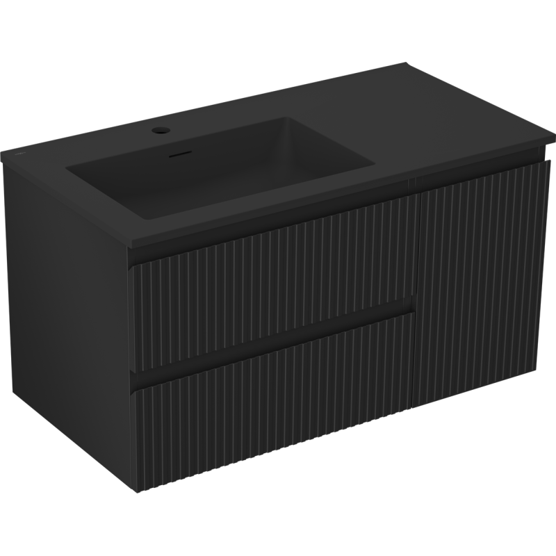 Frontene er laget av lakkert MDF med riflet struktur, noe som gir et moderne uttrykk og et eksklusivt preg til dette svart matte servantskapet. Overflatene på både korpus og fronter er UV-bestandige, slik at fargen holder seg pen over tid uten å falme. Den medfølgende konglomeratservanten i svart matt har både overløp og ferdig hull til servantbatteri, noe som gjør installasjonen enklere og tryggere.