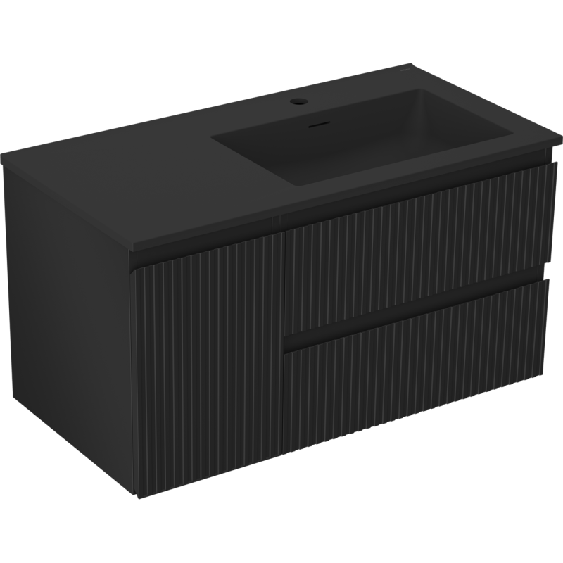Dette servantskapet med vask består av to separate underskap: et 60 cm bredt skuffeskap og et 30 cm bredt skap med dør. Begge enhetene har fronter i riflet, lakkert MDF i svart matt, som gir en moderne og taktil overflate. Korpus er laget av lakkert plate som sikrer god stabilitet og lang levetid, samtidig som overflaten er enkel å holde ren.
