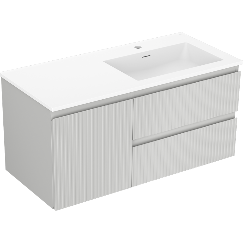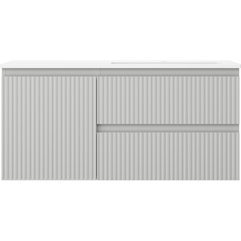 Mexen Rivel er et moderne servantskap med vask i bredde 100 cm, designet for stilrene og funksjonelle bad. Dette baderomsskapet med servant består av to separate underskap – ett med skuffer og ett med dør – kombinert med en Otis høyre vask i matt hvit konglomerat. Løsningen gir en harmonisk grå baderomsinnredning med ryfflede fronter som skaper et eksklusivt og tidløst uttrykk.