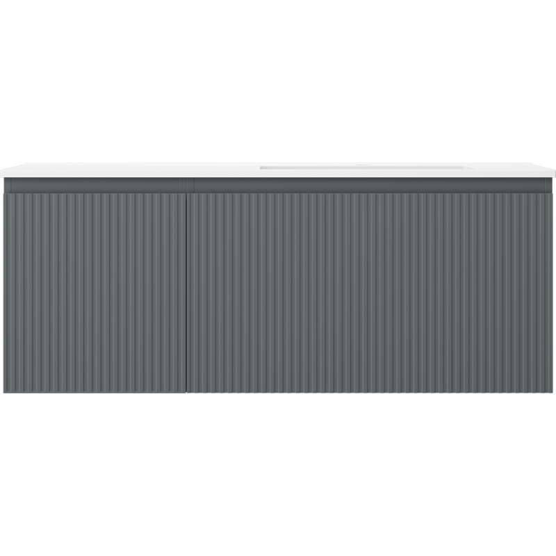 Begge underskap har korpus og fronter i grafitt matt utførelse, med riflete baderomsfronter i lakkert MDF som gir et eksklusivt og moderne preg. Overflaten er UV-bestandig, noe som bidrar til at fargen holder seg pen over tid. Den matte, hvite konglomeratservanten er tilpasset møbelet og gir en harmonisk kontrast til det mørke grafittskroget. Baderomsskap med servant leveres ferdig montert for enkel og rask installasjon.