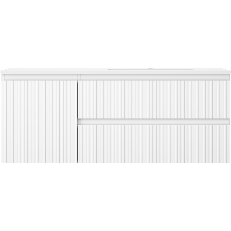 Mexen Rivel baderomsmøbel med skuffer og dør i hvit matt utførelse er et moderne servantskap med vask utviklet for stilrene og funksjonelle baderom. Settets totale bredde er 120 cm og består av et kombinert baderomsskap med servant og en integrert konglomeratservant Mexen Otis med høyre kum. Den riflete frontstrukturen gir et elegant, tidløst uttrykk som passer godt i moderne interiører.