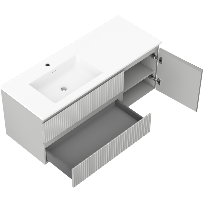 Frontene har en elegant, riflet struktur i grå matt farge som gir et eksklusivt, moderne uttrykk. Korpus er i grå matt, lakkert plate, mens frontene er i lakkert MDF. Den matte, nøytrale fargekombinasjonen grå matt/hvit matt gjør at dette grå matte servantskapet passer inn i både minimalistiske og mer klassiske baderom.