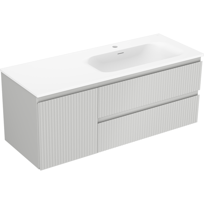 Mexen Rivel er et moderne servantskap med vask i bredde 120 cm, designet for stilrene og funksjonelle bad. Dette baderomsskap med servant består av en kombinert løsning med en romslig skuffeseksjon og et skap med dør, toppet med en elegant hvit matt servant i konglomerat. Helheten gir en harmonisk grå baderomsinnredning med riflede fronter som tilfører et eksklusivt, moderne uttrykk.