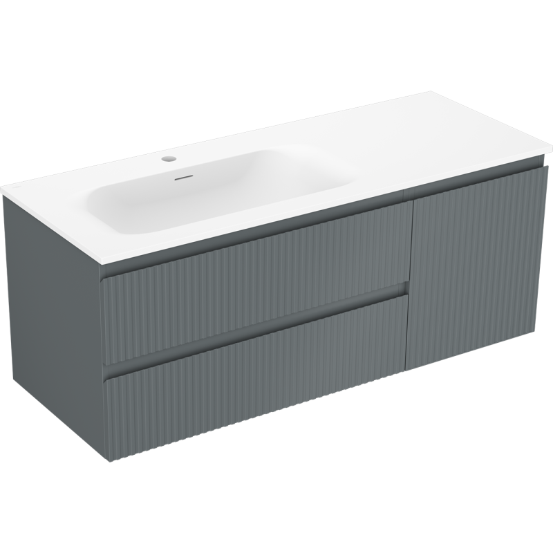 Frontene har en riflet struktur i grafitt matt som gir baderomsmøbelet et eksklusivt, moderne preg. Korpus er utført i lakkert plate, mens frontene er i lakkert MDF, noe som sikrer god formstabilitet og slitestyrke. Den matte overflaten på både baderomsmøbelet i grafitt og vasken gjør at fingermerker og små ujevnheter blir mindre synlige, samtidig som helheten fremstår rolig og elegant.