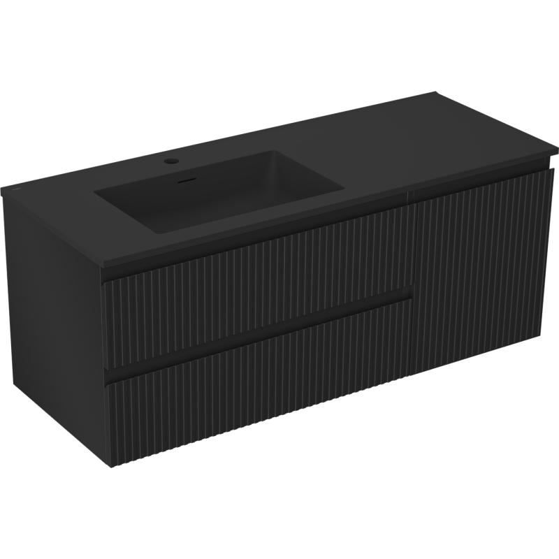 Mexen Rivel er et moderne servantskap med vask i bredde 120 cm, designet som et komplett baderomsskap med servant for stilrene og funksjonelle baderom. Møbelet består av et bad underskap 120 cm i to separate moduler: en skuffeseksjon på 80 cm og et skap med dør på 40 cm, kombinert med en tilpasset konglomeratservant svart Mexen Otis med venstre kum. Helheten gir et eksklusivt uttrykk med riflet front og helsvart, matt finish.