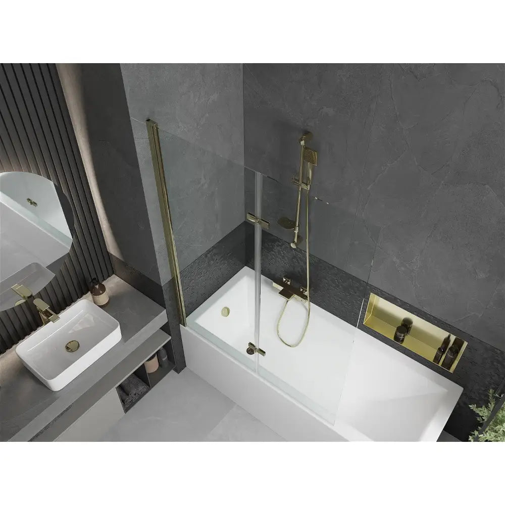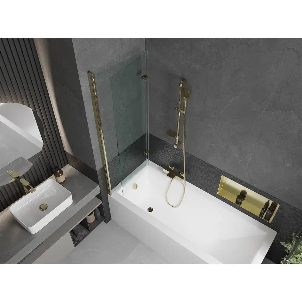 Vår badekarvegg er designet for å gi badet ditt en følelse av luksus og åpenhet. Den transparente glassveggen og den gylne profilen tilfører eleganse, mens den praktiske 2-skrøydle konstruksjonen og 120 cm bredden sørger for enkel tilgang og bruk.