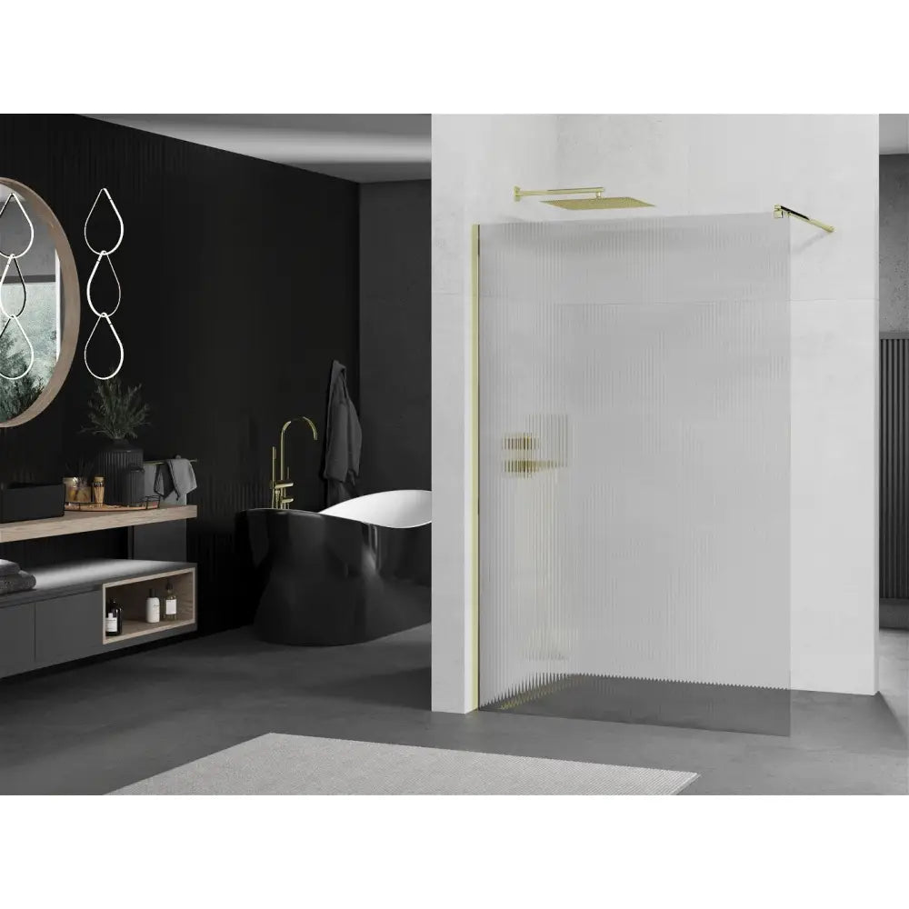 Våre Mexen Kioto dusjvegger er designet for å tilføre et preg av eleganse til ethvert bad. Den gullfargede aluminiumsprofilen og det stripe mønstrede herdede glasset garanterer både privatliv og stil.