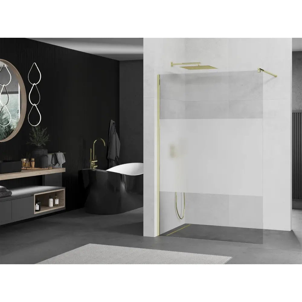 Dusjdøren kommer med et transparent og frostet glassdesign, omrammet av en stilfull gullfarget profil. Dette unike designet tilbyr ikke bare personvern, men tilfører også et moderne touch til ethvert baderom.