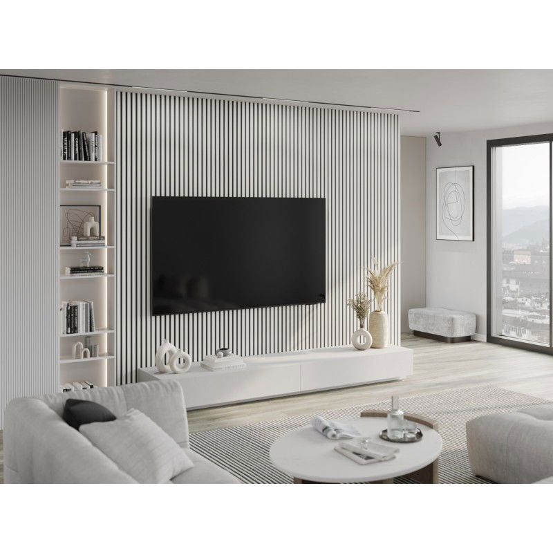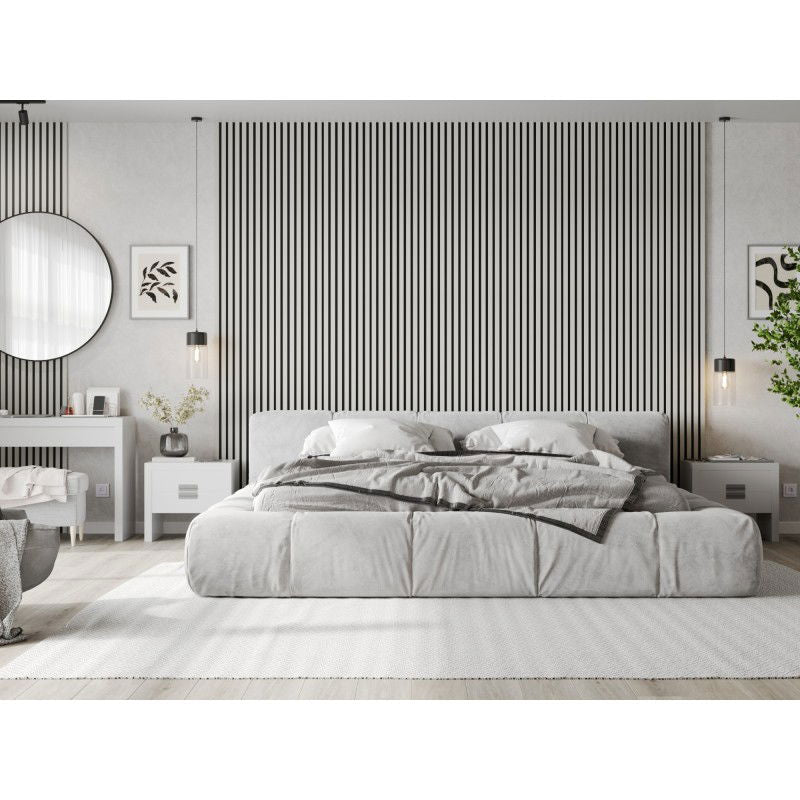 Mexen Lam er dekorative, akustiske spileplater utformet som moderne veggplater for innendørs bruk. Panelet måler 275 x 31,5 cm og består av hvite lameller i matt hvit utførelse montert på en svart filtbakside, noe som gir en tydelig linjeføring og elegant kontrast. Disse veggplatene egner seg svært godt som veggplater kjøkken, veggplater stue og veggplater soverom, og kan monteres både på vegg og i tak i alt fra private hjem til kontorer og hoteller. Materialet i lamellene er MDF med melaminfolie, som gir en jevn, matt overflate med tydelig linjespill og et uttrykk som kan minne om veggplater med trestruktur, samtidig som filten på baksiden bidrar til bedre akustikk. Som veggplater kjøkken kan panelet brukes som dekorativ flate på utvalgte vegger, mens det i andre rom fungerer som et helhetlig, moderne designelement.