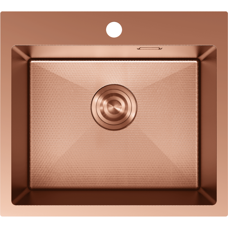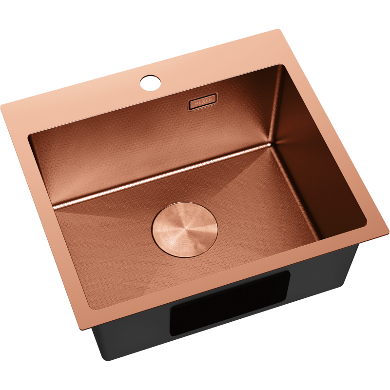Vasken er produsert i høykvalitets rustfritt stål AISI 304 og har en eksklusiv kobberfarget overflate med struktur i bikubemønster. Dette gir en moderne kobberfarget kjøkkenvask som kombinerer stilrent design med høy slitestyrke og praktiske løsninger som integrert overløp, hull for kjøkkenbatteri og manuell avløpsløsning.