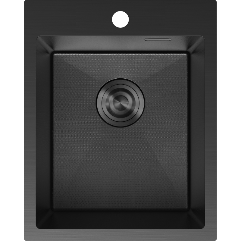 Vaskens kant er laget av 3 mm tykt stål for økt stabilitet og et solid inntrykk, mens selve kummen har 1 mm godstykkelse i rustfritt stål AISI 304 for lang levetid. Den svarte overflaten og det svarte, manuelle avløpssettet gir et helhetlig og gjennomført uttrykk. Vasken leveres med forboret hull for kjøkkenbatteri og har skjult overløp, noe som understreker det rene designet.