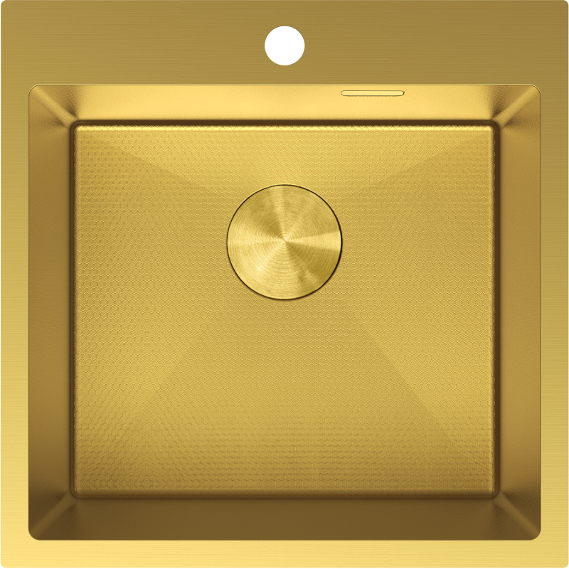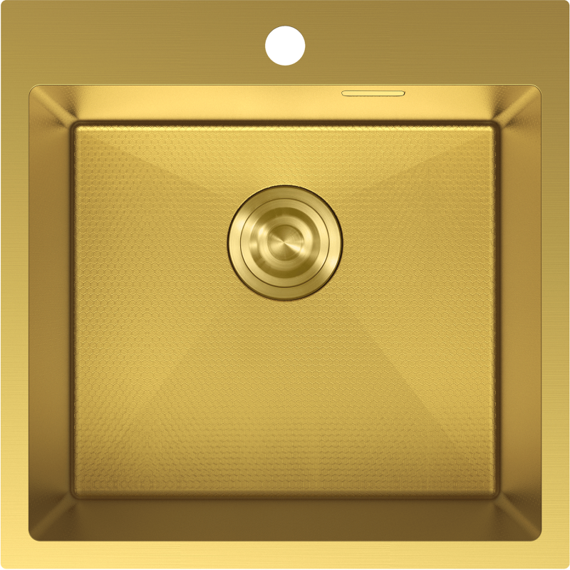 Vasken er produsert i høykvalitets rustfritt stål AISI 304 og har en eksklusiv gullfarge som gir et markant, elegant uttrykk på kjøkkenet. Den karakteristiske overflaten med bikubemønster og det matchende gullfargede avløpssettet gjør denne kjøkkenvasken i gullfarget stål til et stilrent blikkfang i enhver innredning.