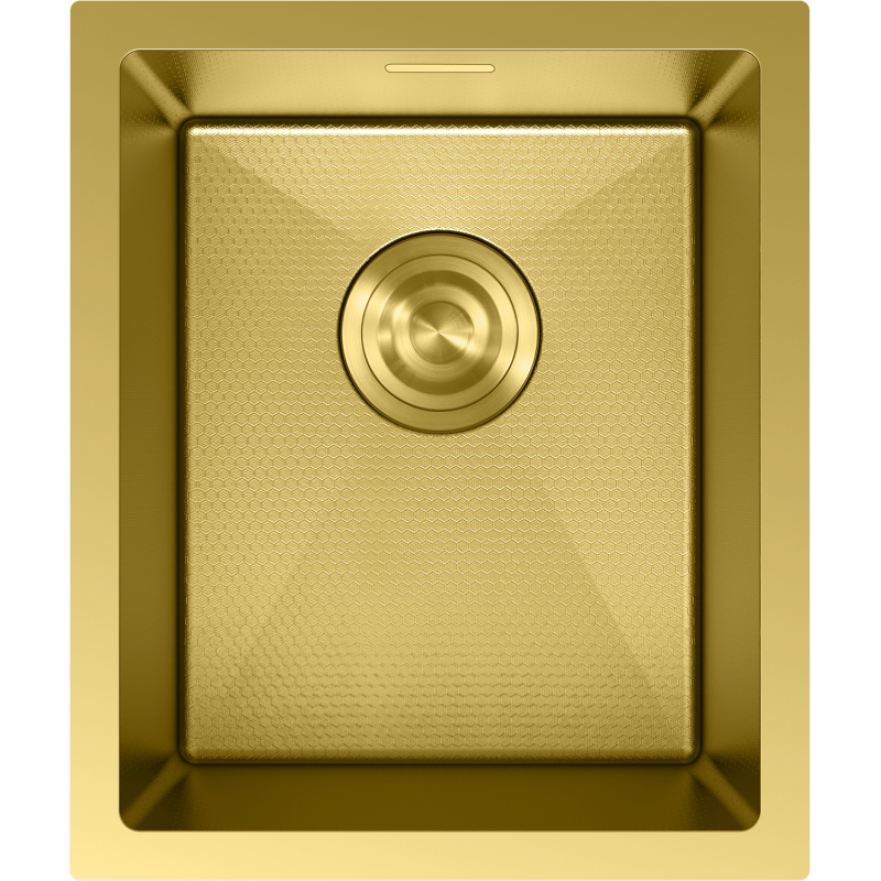 Vasken er produsert i rustfritt stål AISI 304 og leveres i en eksklusiv gullfinish som gir et markant, moderne uttrykk på kjøkkenet. Den karakteristiske bikubemønstererte overflaten gir en dekorativ struktur som samtidig bidrar til å skjule små riper og gjør rengjøringen enklere. Denne kjøkkenvasken i gull kan monteres både som nedfelt kjøkkenvask i stål og som underlimt løsning, noe som gir stor fleksibilitet ved planlegging av kjøkkenet.
