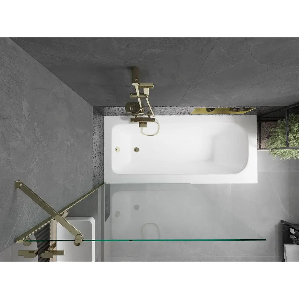 Komplementer ditt badekar med en elegant dusjvegg. Den 1-dørs skjermen er laget av 6 mm tykt herdet glass, sikrer sikkerhet og utholdenhet. Med en høyde på 150 cm og en bredde på 100 cm, beskytter den effektivt mot vannsprut, mens den gull-fargede rammen tilfører et preg av eleganse.