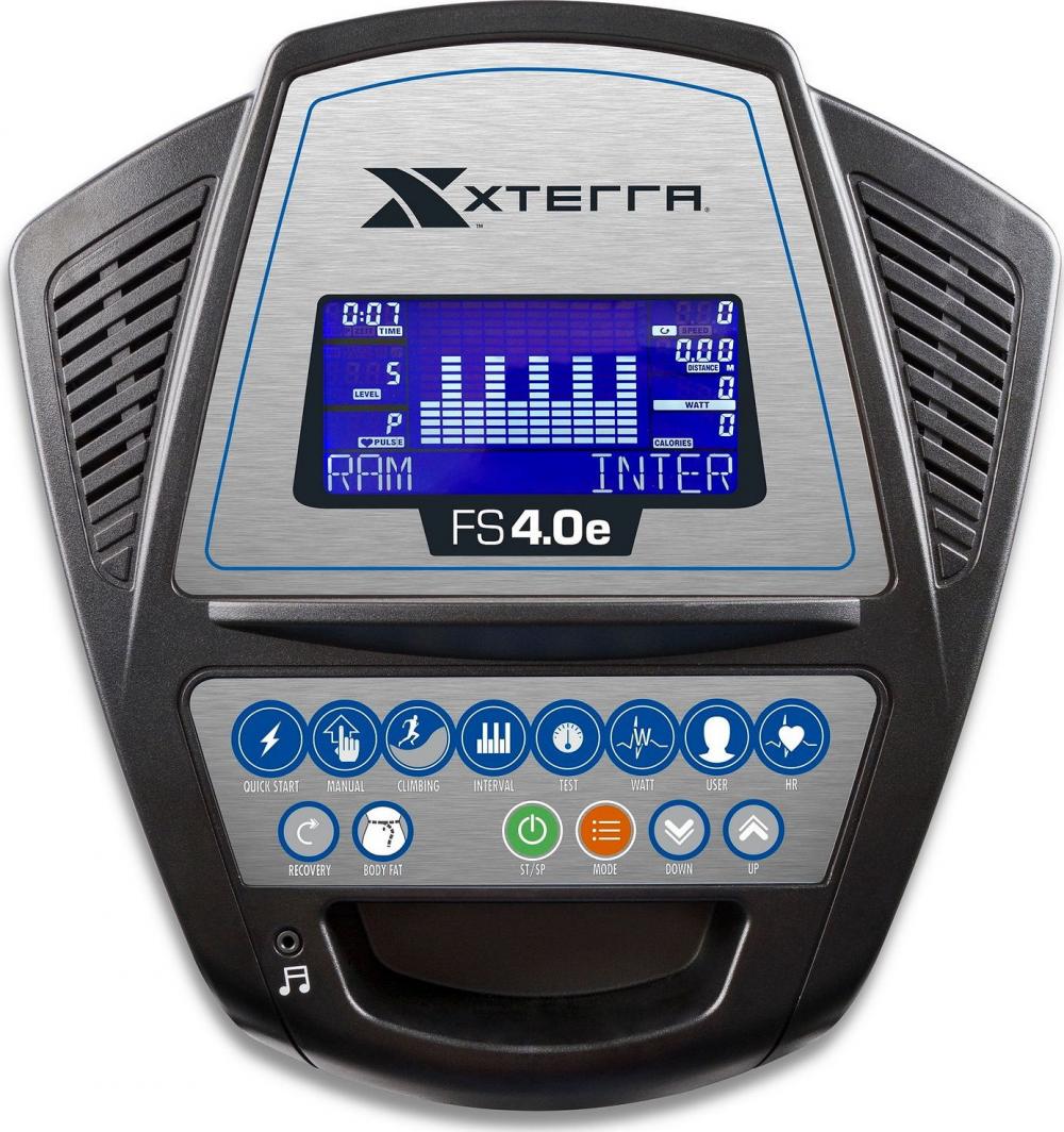 Denne magnetiske ellipsemaskinen styres elektronisk fra et oversiktlig kontrollpanel med 20 motstandsnivåer, slik at du enkelt kan tilpasse belastningen etter formnivå og treningsmål. Et multifunksjonelt LCD-display viser blant annet tid, hastighet, distanse, kaloriforbruk, omdreininger per minutt, puls og effekt. Xterra FS 4.0E har 5 forhåndsdefinerte treningsprogrammer med ulik intensitet, inkludert programmer for fettforbrenning, kondisjon og styrke. Svinghjulet på 8,6 kg sørger for myk og harmonisk bevegelse som skåner ledd og rygg, noe som gjør denne ellipsemaskinen spesielt godt egnet som ellipsemaskin med pulsbelte og programmer til variert og skånsom hjemmetrening.